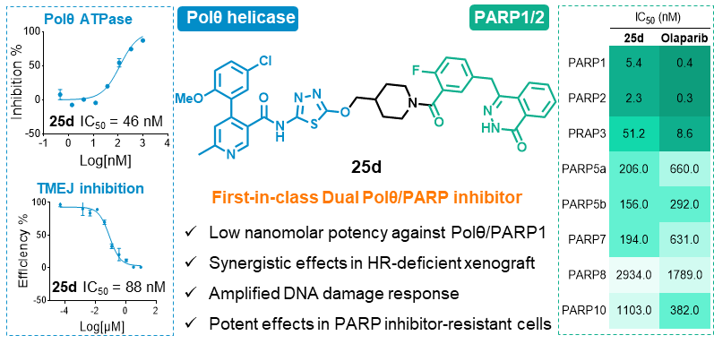 Polθ作为调控DNA损伤修复的关键蛋白,已成为靶向抗肿瘤药物研发的前沿与热门靶标,目前抑制剂报道较少。基于Polθ/PARP在DNA损伤修复途径中的协同机制,及联合Polθ和PARP抑制剂在肿瘤治疗中的优越性,本课题组通过合理药物设计、体内外活性评价,发现了首个Polθ/PARP双靶点抑制剂25d,与单药相比,抗肿瘤优势明显。该研究为靶向Polθ的生物学研究和药物研发提供了重要工具分子。
