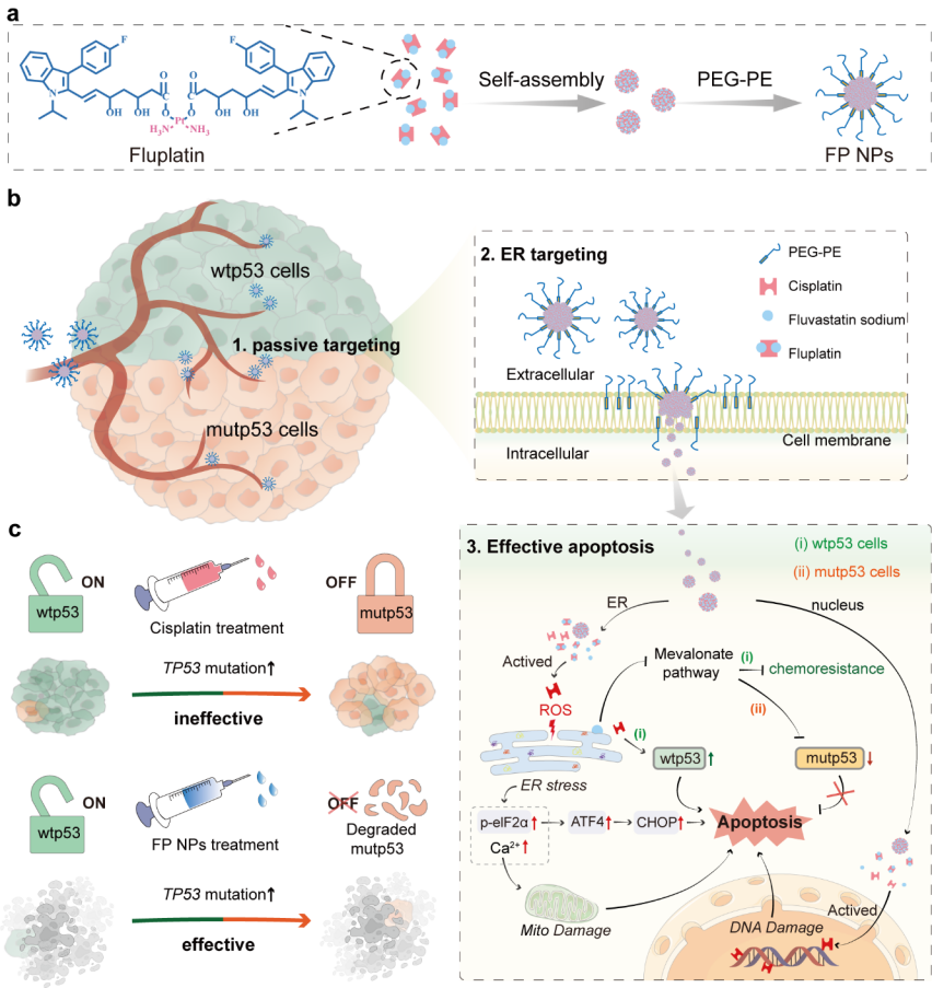 非小细胞肺癌由于TP53高突变水平表现出高耐药性,导致治疗效果差、生存率低。但是作为非小细胞肺癌的一线治疗药物,顺铂也存在引起突变的风险。如果顺铂化疗期间p53突变累积,将进一步影响患者化疗后的生存率。因此,开发一种独立于p53通路的肿瘤药物治疗方案非常重要。为解决这一问题,课题组合成了由顺铂与氟伐他汀组成的Fluplatin并构建了最终制剂FP NPs。FP NPs不受p53突变的限制,靶向内质网后降解突变p53,并高效引发内质网应激,从而独立于p53途径发挥了有效的抗肿瘤作用。FP NPs减缓肿瘤进展,并体现出大幅度改善p53突变所带来的不良预后的潜力。