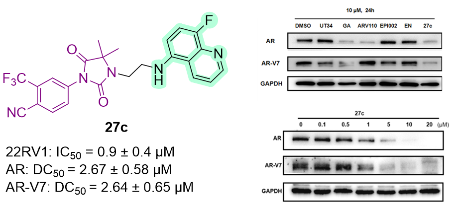 雄激素受体(AR)产生剪接变异体( AR-V7),是抗雄激素药物治疗去势抵抗性前列腺癌(CRPC)耐药的重要原因。现有AR拮抗剂和PROTAC降解剂主要靶向AR配体结合域(LBD),对LBD缺失的剪接变异体AR-V7失效。本课题组长期致力于靶向AR抗肿瘤药物研发,通过表型筛选、分子设计及优化策略,发现了一系列能有效降解AR/AR-V7的单价化合物(MW<500)。优选化合物27c能结合AR-NTD区,并选择性降解AR/AR-V7,而不影响核受体ER、MR,在AR-V7阳性细胞系22RV1和移植瘤中均表现出优于恩杂鲁胺的抗肿瘤效果。本研究为靶向AR-V7的药物研发提供了新的思路和策略。