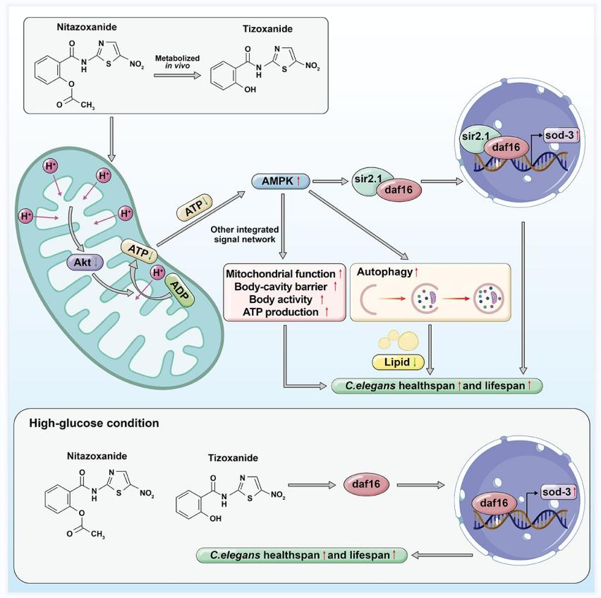 硝唑尼特(Nitazoxanide)是美国FDA批准的抗原虫药物,临床用于治疗隐孢子虫、贾第鞭毛虫、阿米巴原虫引起的腹泻。硝唑尼特体内吸收后迅速代谢为替唑尼特(Tizoxanide)发挥药理作用。董德利教授、孙志洁教授课团队以秀丽隐杆线虫为模式生物,进一步研究了硝唑尼特及其代谢物替唑尼特的抗衰老作用。发现硝唑尼特及替唑尼特通Akt/AMPK/sir2.1/daf-16信号通路和AMPK介导的自噬功能增强延长线虫健康寿命,并改善高糖诱导的线虫寿命缩短。硝唑尼特是一种具有良好安全性的临床药物,该团队首次提出硝唑尼特可能是一种潜在的抗衰老及衰老相关性疾病的药物。