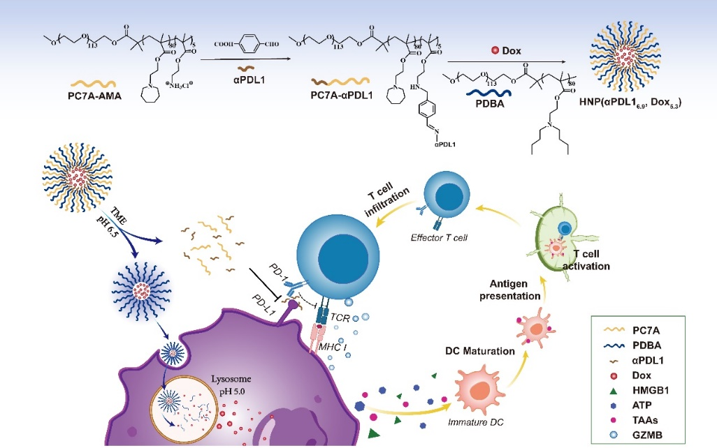 化药与免疫检查点抑制剂联用是临床肿瘤治疗的一线方案,然而两种药物结合靶点分别位于癌细胞内外,非选择性地作用会导致疗效丧失和脱靶毒性。本文立足双药的空间协同性,针对肿瘤微环境与癌细胞内涵体的pH值差异,设计了一种具有逐级解散性质的纳米胶束,分别将免疫检查点抑制剂(αPDL1)与化药(Dox)递释于相应靶点。该制剂显著引起癌细胞免疫原性死亡,诱导树突状细胞成熟和抗原呈递,增加抗原特异性T细胞的浸润,发挥抗肿瘤免疫效应。借助该纳米平台,进一步发现I型常规树突状细胞(cDC1)在肿瘤化免联合治疗中的核心作用,并通过多种基因敲除鼠和临床患者样本探索生物机制。本研究工作提示空间协同性应作为药物共递送体系的设计考量要素。