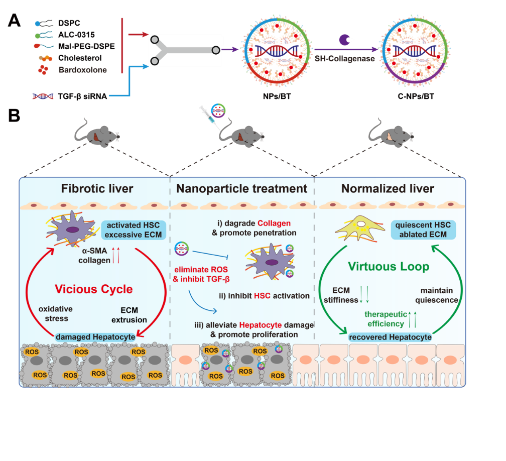 针对纤维化肝脏内“活化的肝星状细胞-受损的肝实质细胞”相互作用构成恶性循环的病理特点,姜虎林教授团队构建恶性循环逆转型药物递送系统,抑制TGFβ信号通路和抗氧化应激,从而抑制肝星状细胞活化并修复受损肝实质细胞,有效调控肝纤维化病理微环境。相关工作以“Pathological Microenvironment-Remodeling Nanoparticles to Alleviate Liver Fibrosis: Reversing Hepatocytes-Hepatic Stellate Cells Malignant Crosstalk’’为题发表在Advanced Science上。三亿体育博士生张凌烽、硕士毕业生邓文琦及王兴欢为共同第一作者,姜虎林教授为本文唯一通讯作者,三亿体育官网为唯一通讯单位。