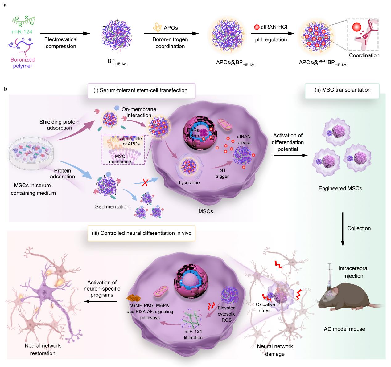 研究团队通过解析蛋白冠功能组分、引入APOs修饰,开发了一种兼具血清耐受性与膜亲和性的干细胞转染纳米系统(APOs@BP),成功实现了在含血清培养条件下安全、高效的干细胞转染。基于此,针对干细胞神经分化时序调控需求,共载促分化剂全反式维甲酸衍生物和内源神经源性关键因子miR-124,利用pH/ROS响应性时序释放机制,依次激活MSCs分化潜能与神经发生通路,稳控指导干细胞在体内外的高效分化,重塑脑内神经环路,为AD等中枢系统疾病治疗提供了新思路和新方案。该团队长期致力于创新干细胞制剂和天然活性微粒对AD的多维防治研究,已在PNAS、Nat Commun、Adv Mater、Nano Lett、Adv Sci.、J Control Release等期刊发表3篇权威和多篇学科顶尖论文,并获得相关发明专利授权5项,期待更多研究合作和转化。