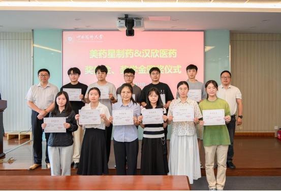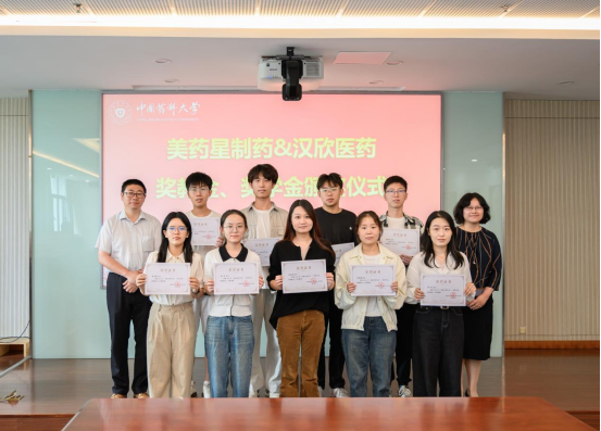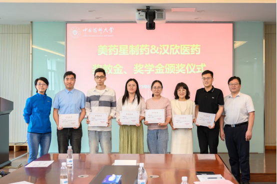 6月12日,三亿体育(以下简称“生科院”)在江宁校区G514会议室联合举办2025年度“汉欣医药与美药星制药联合奖教金、奖学金”颁奖仪式。南京汉欣医药科技有限公司新药研发科学家金波、人力资源经理韩劭,药公司党委书记范素文、生科公司党委书记王臻、药公司党委副书记孟祥康、生科公司党委副书记杨婉和师生代表共同参加活动。