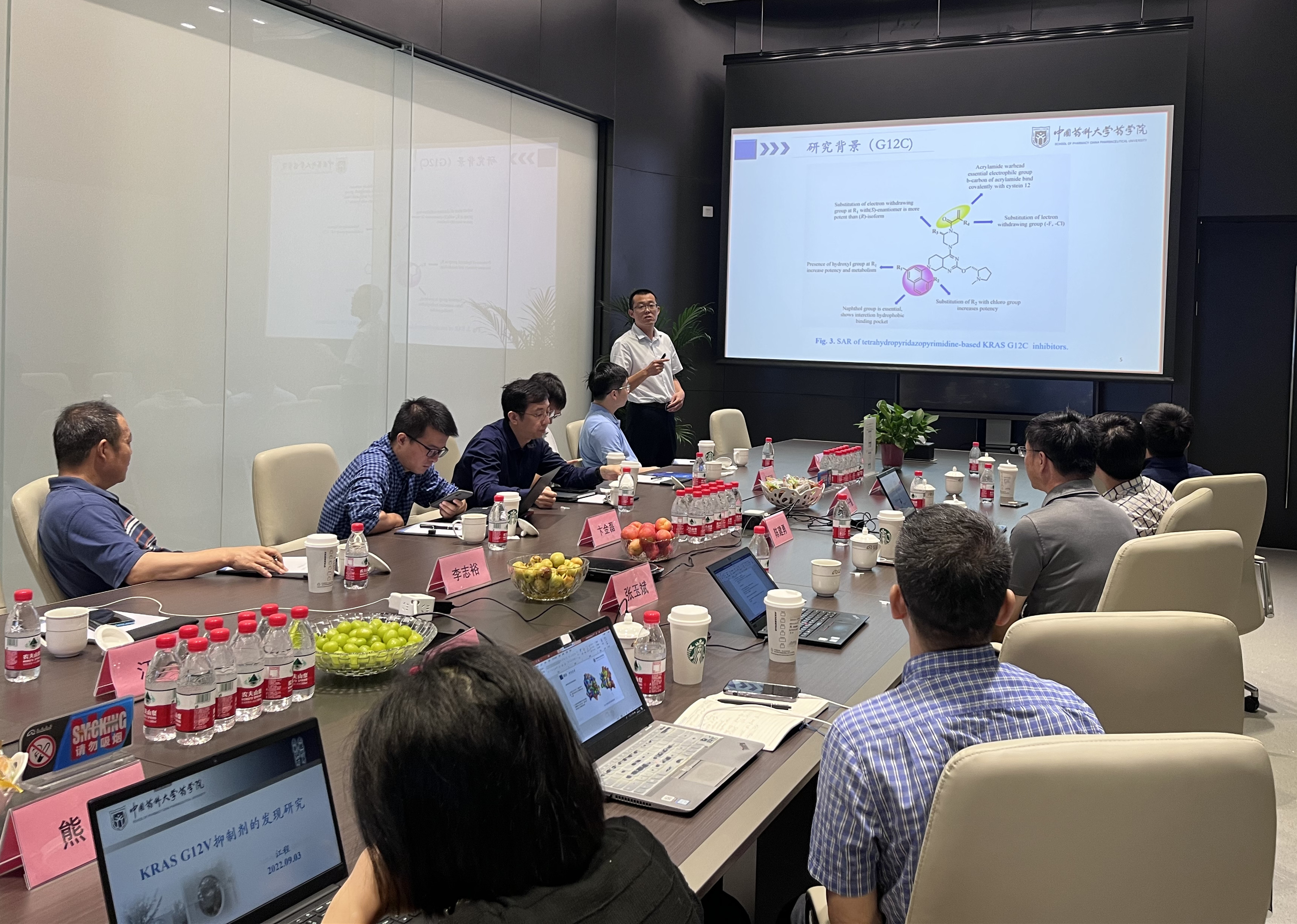 杨大俊董事长首先对公司专家前来交流表示感谢,希望能够通过前期培育的探索性项目打开与药大长期开展科研合作的大门,共同推动校企科研成果加速转化。随后,各项目负责人逐一详细地汇报了项目研究概况及目前取得的研究进展等情况。亚盛医药的科研团队高度肯定了公司团队在科研工作中取得的成绩,双方还围绕课题研究热点展开了热烈探讨。