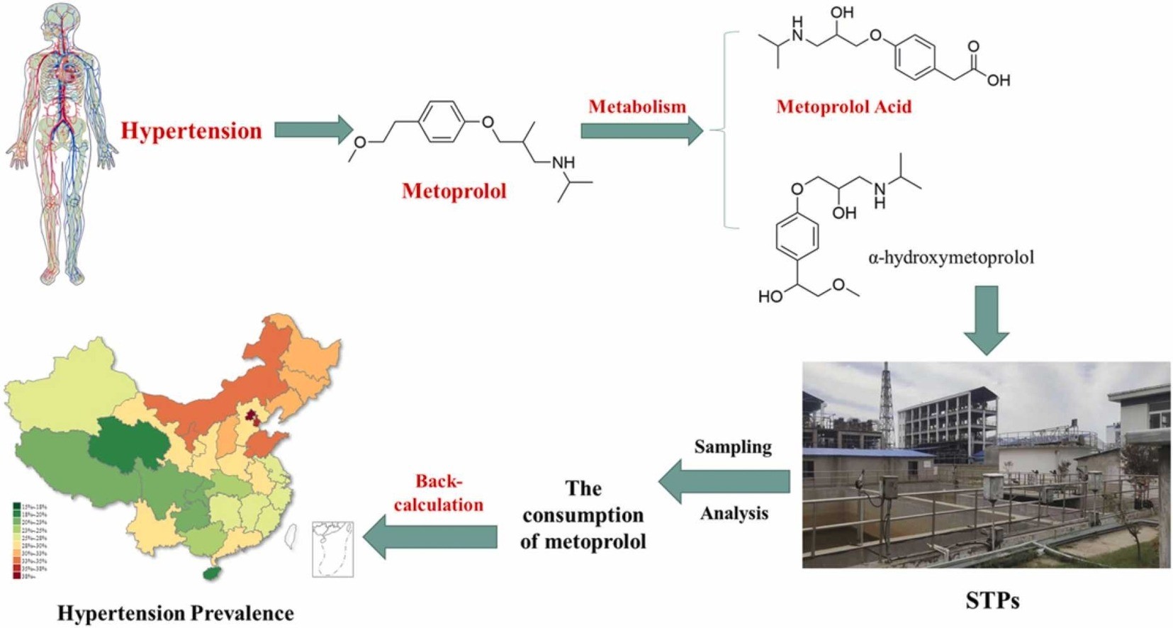 高血压是中国最常见的慢性非传染性疾病,也是严重的公共卫生问题。2015年,中国18岁以上人群中有2.445亿人患有高血压,每年与高血压相关的死亡占中国所有死亡原因的25%以上。为了实时监测高血压患病率,团队在中国164个城市开展了以美托洛尔酸为标志物的废水流行病学(WBE)研究。采用LC-MS/MS对城市生活污水中美托洛尔酸进行定量分析,基于代谢产物美托洛尔酸,反计算临床药物美托洛尔的消费量平均为932.0±390.5 mg/天/1000inh,估算出各地区15岁以上人群的高血压平均患病率为28.56%,与中国高血压病人社会调查结果27.9%高度一致。