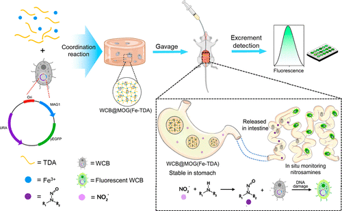 亚硝酸盐是一种广泛用于肉制品、饮用水、蔬菜和水果的食品添加剂。但过量亚硝酸盐可以通过胃肠道菌群转化为亚硝胺,即通过细胞色素P450转化为α-羟亚硝胺,分解成高活性阳离子或重氮,从而导致DNA烷基化,造成引发癌症的风险。目前,食品中亚硝胺的检测主要通过气相色谱-质谱 (GC-MS)或液相色谱-质谱 (LC-MS)等方法,然而尚缺少原位检测亚硝胺的方法。因此,为了准确检测体内产生的亚硝胺,该工作设计了一种金属有机凝胶 (MOG)保护的细胞生物传感器 (WCB),即WCB@MOG。为了保护WCB免受胃酸环境的影响,设计了一种由Fe3+和2,2’-硫代二乙酸 (TDA)制备而成的MOG (Fe-TDA)来包封WCB。Fe-TDA具有抗胃酸性,可将WCB输送到肠道,而不会影响原位检测亚硝胺的性能。实验结果表明,WCB@MOG(Fe-TDA)在肠道中释放出WCB,可以通过测定小鼠排泄物中的WCB荧光信号强度监测肠道中的亚硝胺,最终成功用于研究小鼠体内亚硝酸盐向亚硝胺的转化。