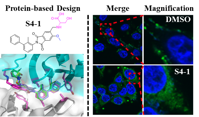 PD-L1蛋白在肿瘤细胞表面广泛分布,表达上调的PD-L1与T细胞表面的PD-1结合将抑制T细胞的增殖与激活,肿瘤细胞将实现“免疫逃逸”。本研究报道了一类邻苯二甲酰亚胺类化合物,并进行了系统的构效关系研究。优选化合物S4-1蛋白水平IC50值为6.1 nM,显著抑制PD-1/PD-L1蛋白-蛋白相互作用。药效学评估过程中,S4-1通过降低PD-1/PD-L1相互作用,在细胞和动物水平恢复T细胞的活化,增强免疫细胞的抗肿瘤活性。