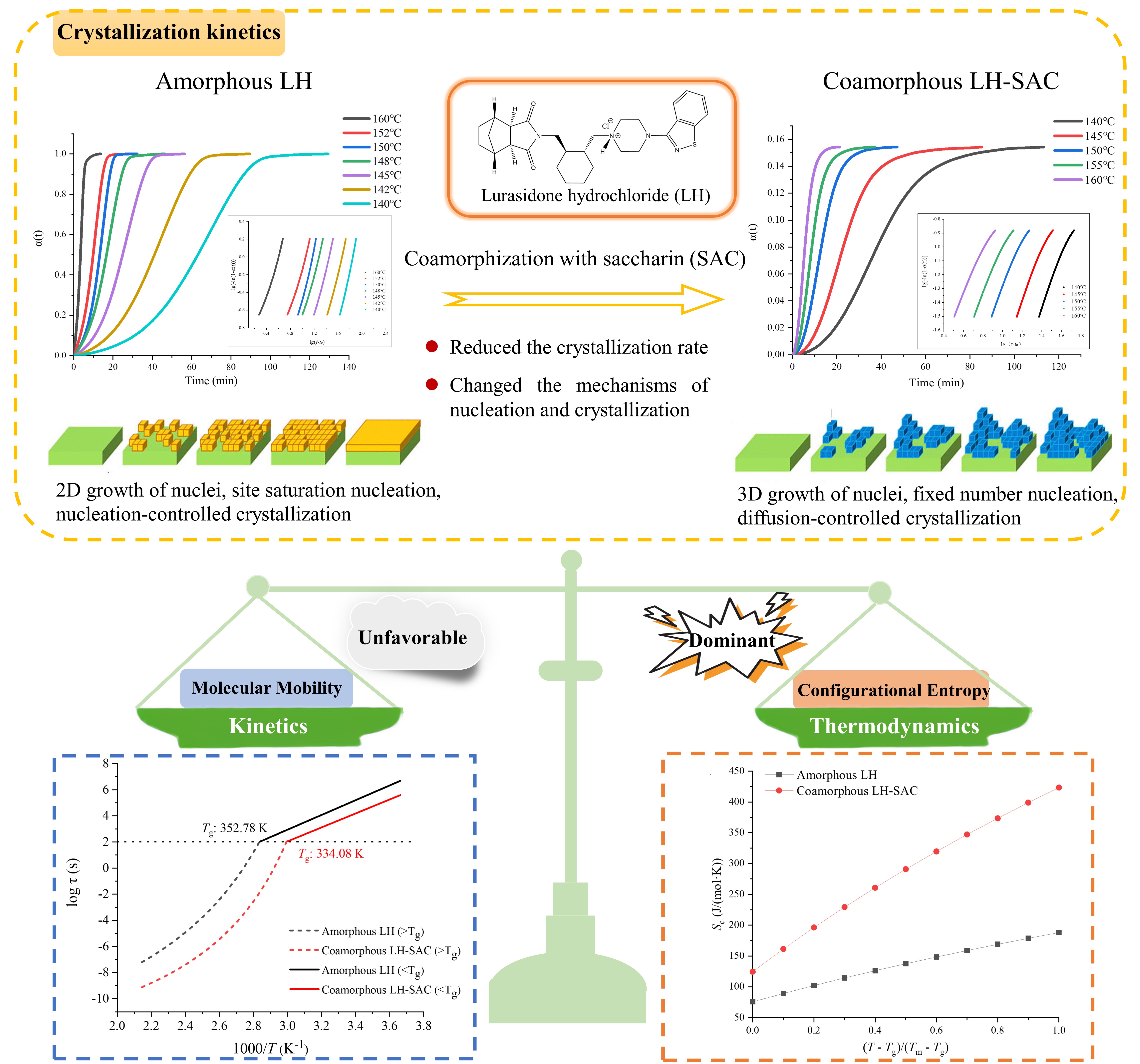 本研究中,张建军/高缘团队以精神疾病治疗药物盐酸鲁拉西酮为模型,系统研究了其与糖精所形成共无定形的结晶机制,并从热力学和动力学两个角度综合阐明了共无定形体系在分子水平上改善稳定性的机制。研究结果表明,与单独药物无定形相比,共无定形体系在玻璃态和过冷液态的结晶速率显著降低;且成核机制由位置饱和成核转变为固定数量成核,晶体生长由2D向3D成核生长发生转变,结晶机制由成核控制转变为扩散控制;并创新性地提出了热力学因素(构型熵)而非动力学因素(分子运动性)对共无定形稳定性改善的重要贡献,同时结合分子动力学模拟手段从分子水平揭示了共无定形的结晶机理。本研究有助于深入理解药物共无定形的结晶行为及稳定性机制,为共无定形处方的合理设计及其产品开发奠定了理论基础。