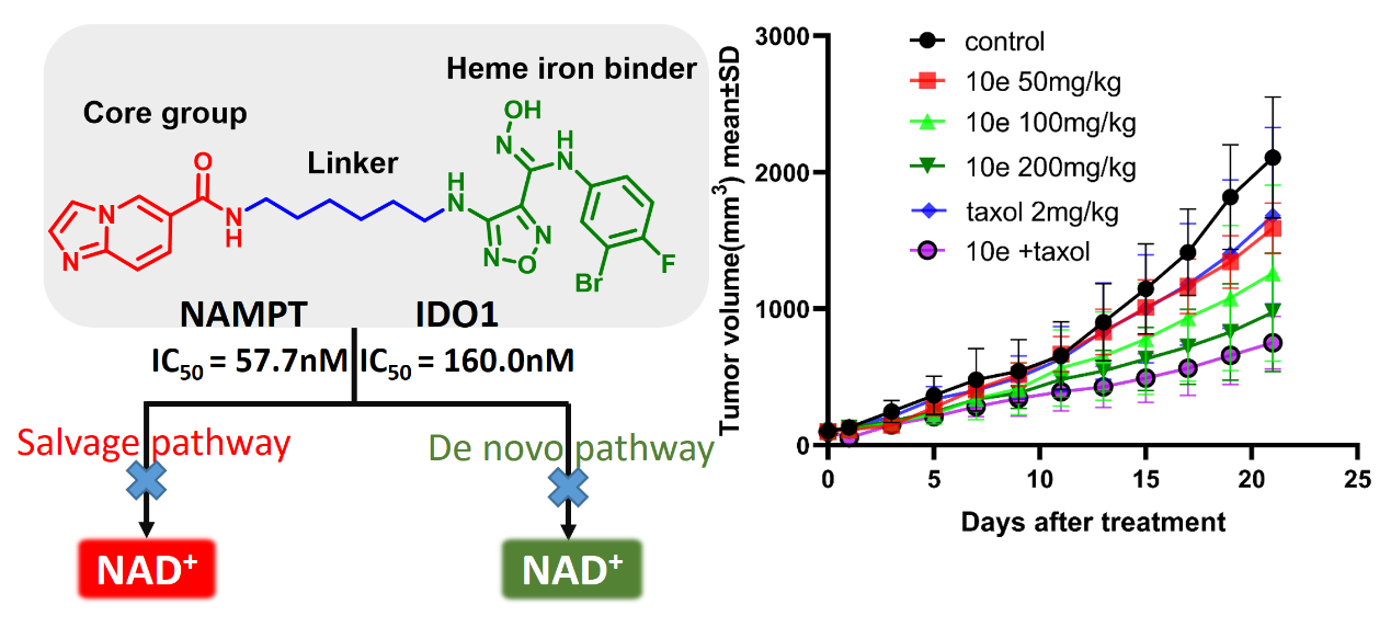 基于前期研究基础(J. Med. Chem. 2022, 65, 7746-7769),课题组发现IDO1高表达是紫杉醇耐药非小细胞肺癌A549/R细胞对NAMPT抑制剂也耐药的重要原因;而IDO1抑制剂和NAMPT抑制剂联合用药显著降低细胞内NAD+的水平,对A549/R细胞中具有更好的抗增殖和抗迁移活性。基于这些发现,课题组首次设计并合成了NAMPT/IDO1双靶点抑制剂。优选化合物10d具有较好的NAMPT和IDO1酶抑制活性,能够显著降低细胞内NAD+的水平,在A549/R细胞中表现出显著的抗增殖和抗迁移活性。采用细胞和斑马鱼模型表明,10d有效诱导活性氧的产生,并且能够促进IDO1通过蛋白酶体途径发生降解。10d在A549/R小鼠移植瘤模型中表现出良好的抗肿瘤活性,且无明显毒性。上述研究内容为缓解非小细胞肺癌耐药以及转移等关键问题提供新的思路。