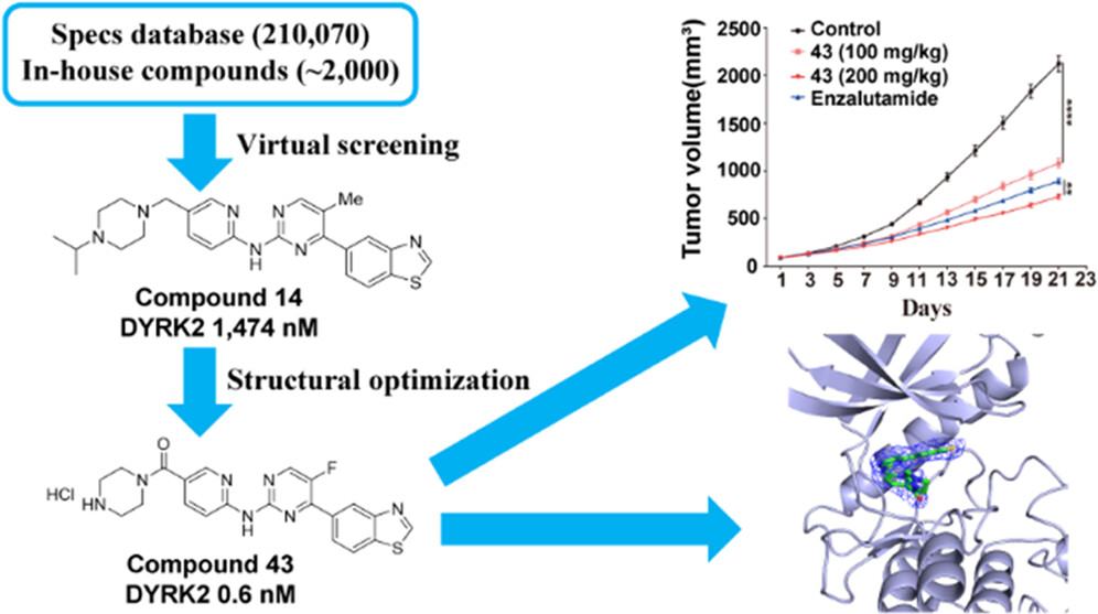 课题组通过基于蛋白的虚拟筛选和后续系统的结构优化,获得优选化合物43,其对DYRK2的IC50为0.6 nM,且激酶选择性良好;同时,成功解析出化合物43与DYRK2的共晶结构,阐明了相互作用机制。化合物43对前列腺癌细胞有显著的增殖、迁移抑制和凋亡诱导作用,且具有良好的水溶性(29.5 mg/mL)。动物实验显示,化合物43具有较高的安全性(LD50 >10,000 mg/kg),并显著抑制前列腺癌异种移植瘤的生长。因此,此项研究为新型前列腺癌治疗药物的开发提供了潜在的候选化合物。