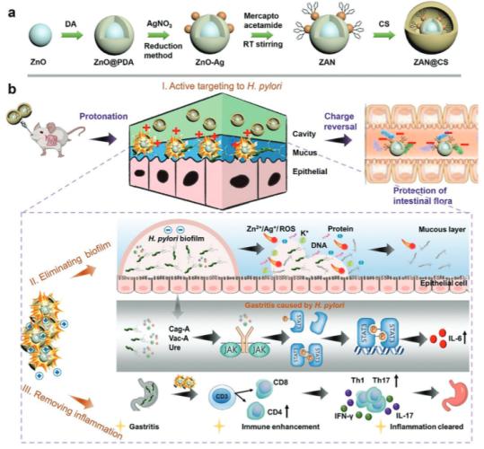 针对使用抗生素疗法治疗幽门螺杆菌带来的药物安全问题,研究团队研制了一种可质子化的金属基纳米药物ZAN@CS。研究发现,该纳米药物具有电荷转换能力,在胃内酸性条件下质子化带正电荷,主动靶向幽门螺杆菌,破坏细菌细胞膜,瓦解生物膜结构,最终彻底清除细菌。体内实验证明,ZAN@CS可穿透胃粘膜屏障,延长胃内滞留时间。使用该纳米药物治疗后,模型小鼠幽门螺杆菌定植量显著降低,毒力因子CagA等表达水平明显下降。此外,ZAN@CS可调节免疫反应并减轻胃内炎症,治疗期间胃内CD4+T细胞含量明显增加,促炎因子IL-6等表达水平降低。同时,ZAN@CS在肠道不发生质子化作用,对小鼠肠道细菌菌种组成等均无影响,且在28小时后可完全被代谢清除。该研究为幽门螺杆菌治疗拓展了新的思路和方法。