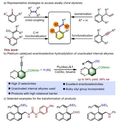 过渡金属催化的内部炔烃立体选择性氢官能化反应,已成为构建具有单一立体构型的三取代烯烃的实用工具。然而,通过该策略构建轴手性化合物更富挑战性(即需要同时实现反应的区域选择性、双键立体选择性以及对映选择性控制),目前仍有待发展。鉴于轴手性化合物的在药物化学和不对称催化领域中的重要性和普遍性(图1a),进一步开发新型轴手性化合物合成方法仍至关重要。该团队设计开发了一类铂催化内部炔烃不对称氢硅化反应,为轴手性苯乙烯骨架的构建提供了高效合成路径(图1b)。对照实验表明,NH芳酰胺基团作为导向基团,对产率和对映选择性都有显著影响。同时,热消旋化实验表明该类化合物具有较好的稳定性,为此类化合物的后续应用奠定了基础。