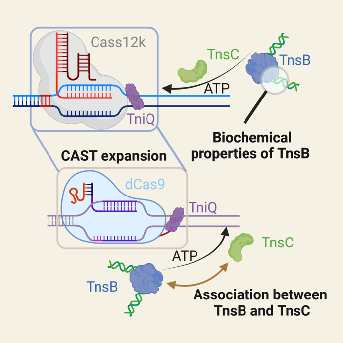 传统的TALEN、CRISPR-Cas9等核酸酶介导的基因插入依赖于DNA产生双链缺口以及同源重组,存在染色体异位或重排等风险且插入效率较为低下。研究团队聚焦CRISPR相关转座子(CRISPR-associated transposons, CAST),该系统能够介导RNA引导的DNA定点整合,且融合了Tn7转座子的整合高效性以及CRISPR-Cas系统的靶向特异性,相比传统的基因插入方法在效率和安全性上都具备天然的优势。文章首先系统性地探究了该系统中转座酶TnsB的催化机制,明确了TnsB是3'-5'核酸外切酶且其切割和整合活性依赖于对donor DNA末端重复序列的识别。为了进一步拓展CAST系统的应用前景,研究进一步对该系统进行精简改造,尝试将Cas12k替换成dCas9并将其与TniQ进行融合。结果显示N端融合TniQ的dCas9能成功介导TnsB/TnsC催化的基因定点插入。上述发现表明CAST系统具有作为可编程位点特异性基因插入工具的巨大潜力,为今后挖掘和改造以获得更为高效可行的基因定点插入工具提供重要的理论依据。