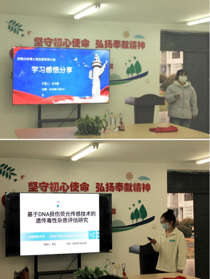 李洁同学和左万超同学作为支部内获得研究生国家奖学金的优秀员工代表,和大家分享了科研心得感悟,李洁同学对其研究课题“基于DNA损伤荧光传感技术的遗传毒性杂质评估研究”进行了介绍,左万超同学分享了自读研以来的学习感悟,并就如何做好科研的同时快乐生活进行了经验分享。